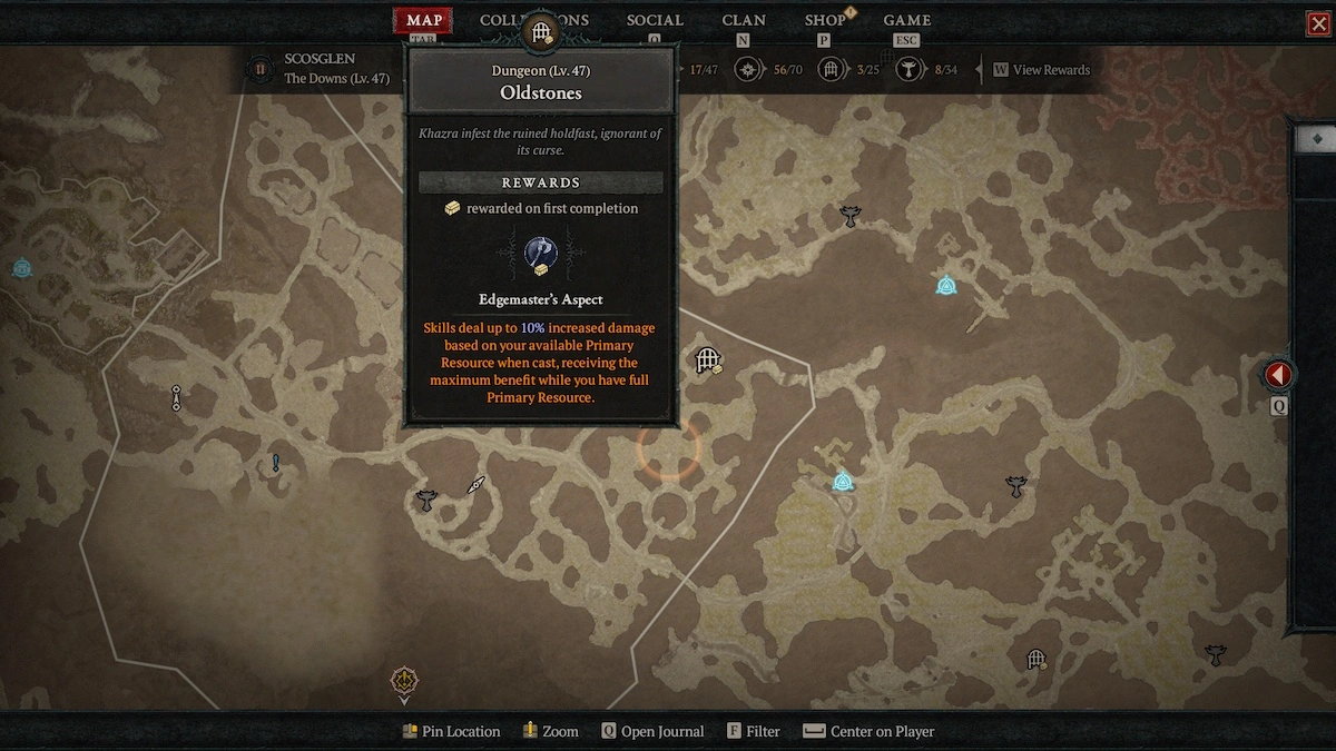 ใน Scosglen ให้มุ่งหน้าไปยังพื้นที่ที่เรียกว่า The Downs คุณจะพบ Dungeon ชื่อ Oldstones เร็วๆ นี้ ทำดันเจี้ยนนี้ให้สำเร็จ แล้วคุณจะปลดล็อก Edgemaster’s Aspect