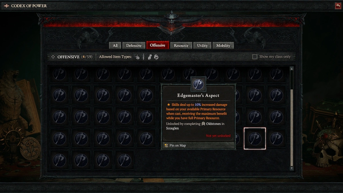 แม้ว่าจะมี Aspects บางอย่างที่เป็นเอกสิทธิ์ของคลาส แต่ก็มีอย่างอื่นสำหรับตัวละครทุกประเภท มุมมองของ Edgemaster เป็นมุมมองเชิงรุกที่จะ เพิ่มความเสียหายของทักษะของคุณมากถึง 24% ตามทรัพยากรหลักที่คุณมีอยู่เมื่อร่าย เมื่อทรัพยากรหลักของคุณเต็ม มันจะมีประโยชน์สูงสุด