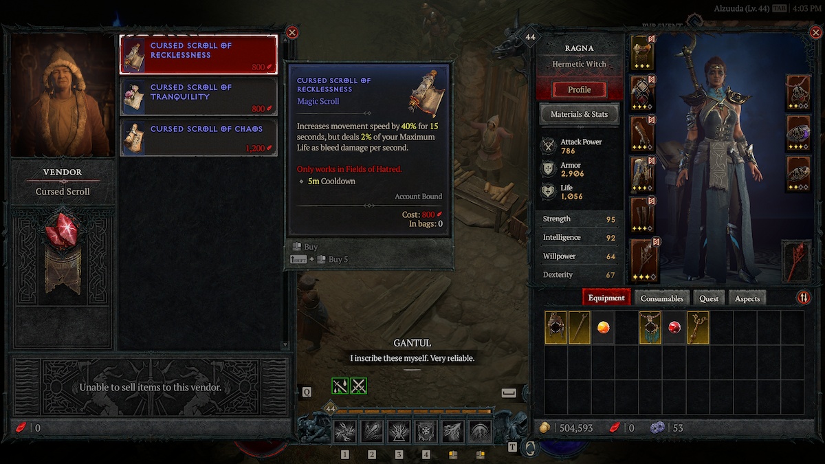 นอกจากนี้ยังมี มีบางอย่างในเมืองในทุ่งนี้ที่คุณสามารถซื้อเพื่อช่วยคุณได้ โดยปกติแล้วการซื้อ Scrolls จะมีราคา 800 Red Dust และใช้ได้เฉพาะใน Fields of Hatred เท่านั้น คัมภีร์บางอันสามารถเทเลพอร์ตคุณไปที่ไหนสักแห่งแบบสุ่มในช่วงเวลาที่ร้อนระอุหากคุณกังวลว่าจะตาย